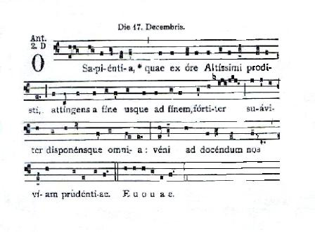 | O Sapientia, quæ ex ore Altissimi prodiisti, attingens a fine usque ad finem, fortiter, suaviterque disponens omnia; veni ad docendum nos viam prudentiæ. | O Wisdom, that proceedest from the mouth of the Most High, reaching from end to end, disposing all things with strength and sweetness! come and teach us the way of prudence. |
